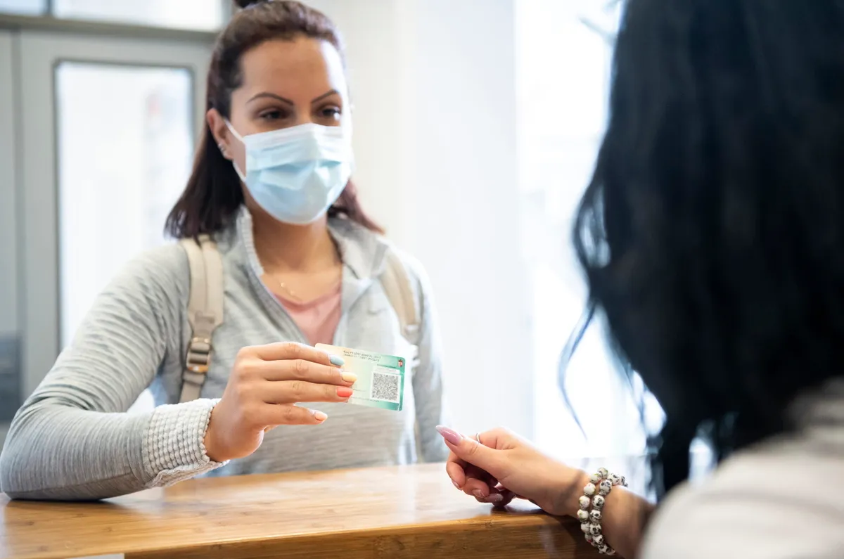 Egy nõ felmutatja védettségi igazolványát egy belvárosi edzõterem vendégpultjánál Nyíregyházán 2021. május 3-án.