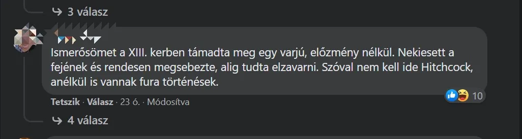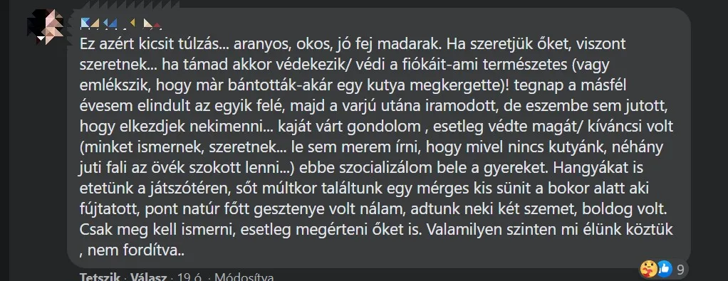 Más is tapasztalta a madarak agresszív viselkedését, köztük egy XIII. kerületi hölgy is, akinek a barátjára minden előzmény nélkül támadt rá egy varjú. „Nekiesett a fejének és rendesen megsebezte, alig tudta elzavarni.” Egy férfi szerint a dolmányos varjak az utóbbi időben túlszaporodtak, és igazi „csúcsragadozó” lett belőlük. „Régebben harkály és sárgarigó is volt, de bejöttek dolmányosék és mind eltűntek!” - írja egy hölgy.