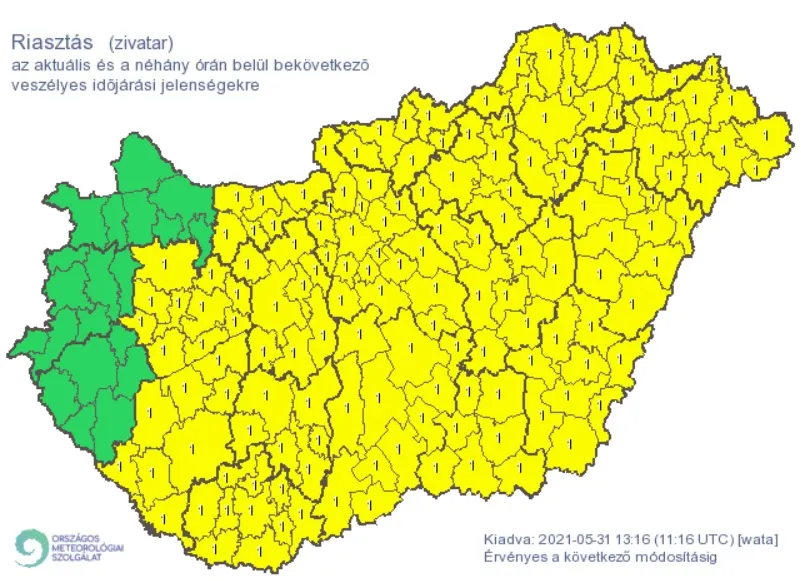 Elsőfokú riasztást adott ki az Országos Meteorológiai Szolgálat zivatarokra. Csupán három megyében nem kell tartani a hirtelen lezúduló eső miatt.