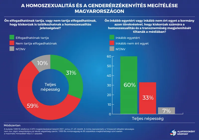 A jogszabály alapvetésével ugyanakkor a magyarok 60 százaléka egyetért, ennyien támogatják ugyanis, hogy a homoszexualitás és a transzneműség megjelenítését tiltsák a kiskorúak számára is elérhető médiafelületeken – és csak a válaszadók 33 százaléka nem értett egyet a fenti célkitűzéssel.