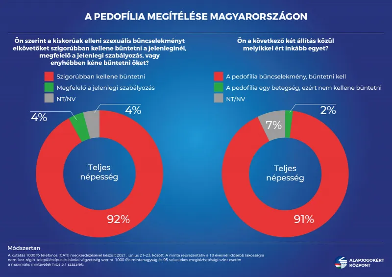 A magyarok óriási többsége, 92 százaléka ugyanis egyetért a pedofilok szigorúbb büntetésével, míg szintén nagy részük, 60 százalékuk szerint a kiskorúakat meg kell óvni a médiában megjelenő gender- és homoszexuális-propagandától – írja az Alapjogokért Központ elemző- és kutatóintézet.