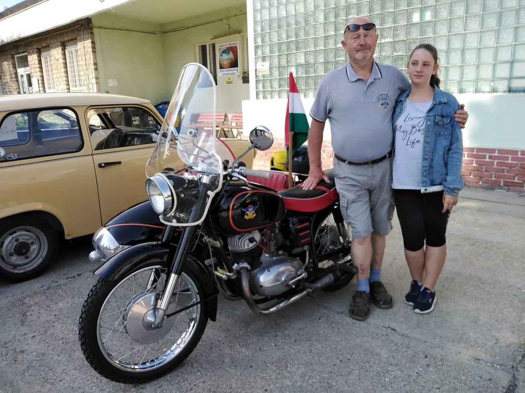 A motorral a Veterán Járművek Baráti Köre Ajka Egyesület tagjaival együtt indult Ajkáról az Alsóőrs-Kislőd Ajka emléktúrára, amit tagtársuk, Nagy Attila emlékére szerveztek a hétvégén. Vele tartott unokája, Laura is, akitől megtudtuk: ha eléri azt az életkort, hogy vizsgázhat, megszerzi motorra a jogosítványt.