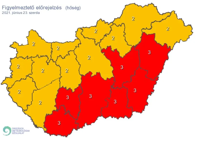 Kedden 0:00 órától a legmagasabb, harmadfokú hőségriasztás lépett életbe országszerte. A szerdai nap folyamán Baranya, Bács-Kiskun, Csongrád-Csanád, Tolna, Békés, Jász-Nagykun-Szolnok és Hajdú-Bihar megyében is elviselhetetlen hőség várható.