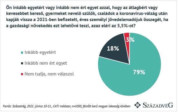 A kutatás alapján kijelenthető, hogy a gyermeket nevelő családokat érintő kedvezmény kapcsán társadalmi konszenzus alakult ki. A megkérdezettek több mint háromnegyede (79 százaléka) egyetért azzal, hogy a gyermeket nevelő szülők, családok kapják vissza a 2021-ben befizetett személyi jövedelemadót, ha Magyarország gazdasági növekedése eléri az 5,5 százalékot. A tervezett intézkedést ellenzők aránya 18 százalékra tehető.