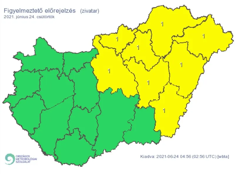 Ezt követően a késő esti órákban újabb zivatarrendszer kerülhet közel az északnyugati határainkhoz. A zivatarokat viharos (akár > 60-80 km/h) széllökések kísérhetik, az erősebb gócokhoz jégeső (esetleg akár > 2 cm), illetve intenzív csapadék is társulhat.