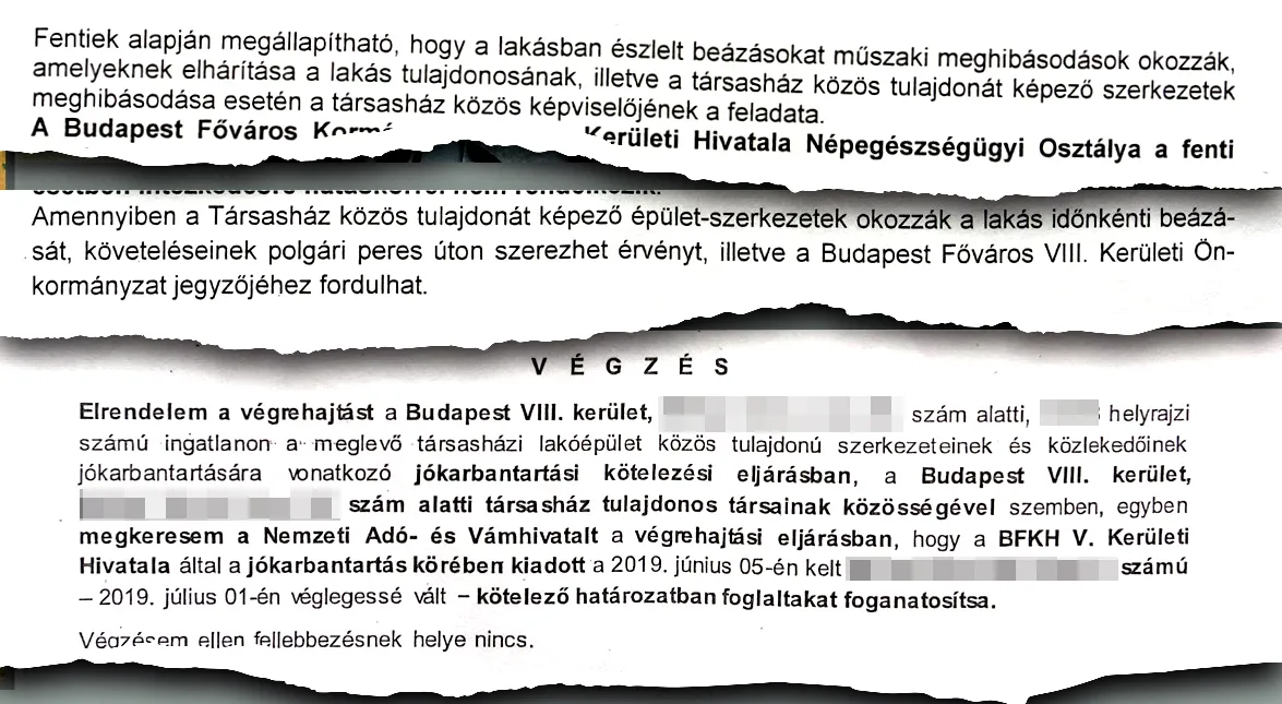 Pedig Budapest kormányhivatala elrendelte „karbantartási kötelezettségi eljárásban” a közös tulajdonú közlekedők és szerkezetek javítását. Az ereszcsatornát és a homlokzatot veszélyesnek ítélték meg. A közegészségügyi vélemény szerint is a beázások miatt nem lehet életvitelszerűen használni a lakást.