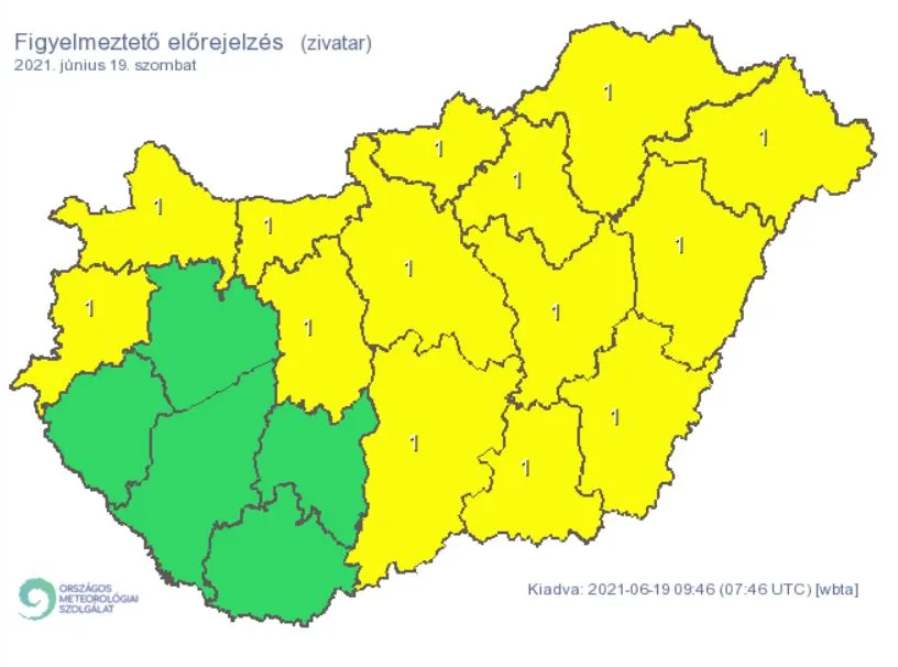 Elsőfokú, citromsárga riasztást adott ki zivatarok kialakulása miatt az Országos Meteorológiai Szolgálat. Az érintett területeken elsődleges veszélyforrást a villámlás jelent, emellett esetenként megerősödhet a szél, és jégeső is előfordulhat.