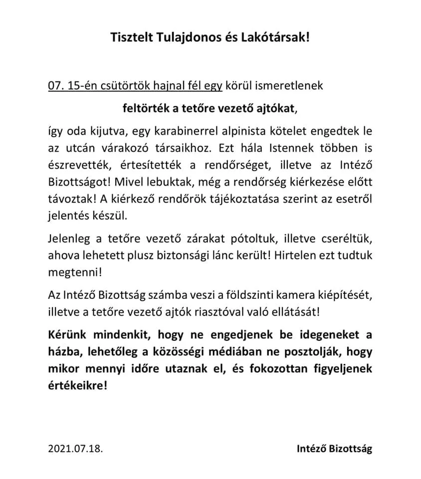 A házban élők a történtek után az új zárak mellett biztonsági láncot is szereltek a tetőre vezető ajtóra. Az Intéző Bizottság pedig fontolóra veszi egy földszinti kamerarendszer kiépítését – tudta meg a Metropol.