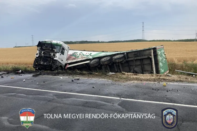 Úgy tudni, az árokba borult kamion eleje teljesen összeroncsolódott. A helyszíni vizsgálat és a műszaki mentés idejére az útszakaszt lezárták.
