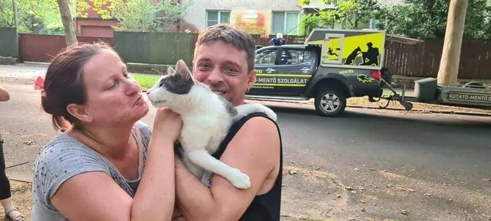 Kedd este adta át a Pest Megyei Kutató-Mentő Szolgálat gazdájának azt a cicát, aki egy fa ágán igyekezte túlélni veszélyes kalandját. Kyra a hőségtől gyakorlatilag élet és halál között lebegve lógott 14 méter magasan egy fa ágán a XVI. kerületi Hunyadvár utcánál, egészen a cicamentés idejéig.
