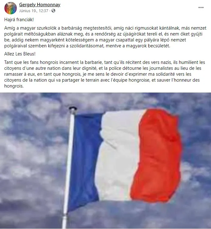 Azt állítja Homonnay Gergely, Gyurcsányék megmondóembere, a magyarok becsületét mentendő írta meg a magyar válogatott franciák elleni mérkőzése elé időzített posztját, mely a „Hajrá, franciák!” felütéssel indult, s melyben lenácizta a magyar drukkereket, a Puskás Arénában szurkoló hatvanezer embert.