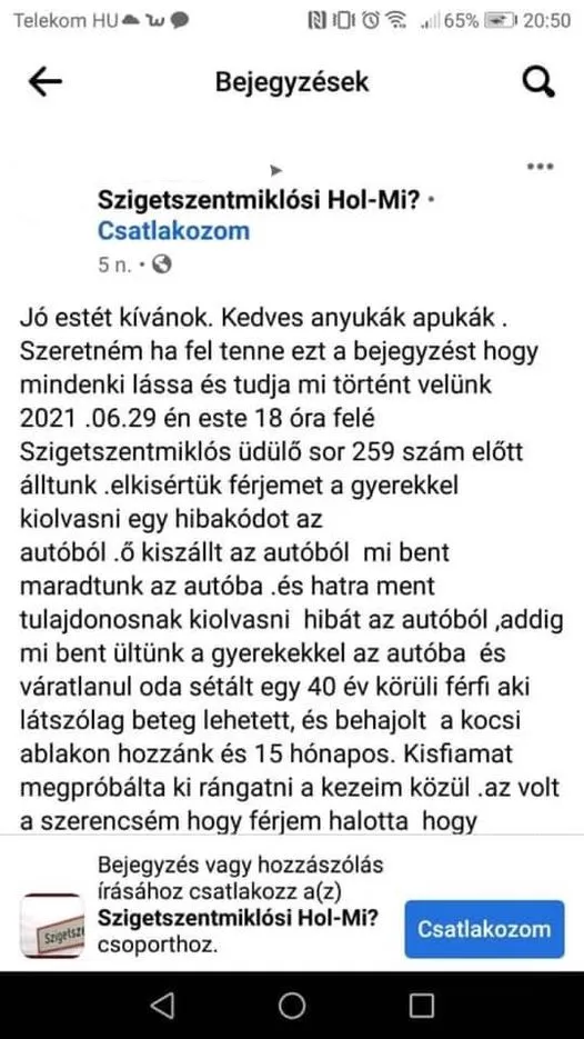 A poszt szerint N. Ivett és családja még múlt hét kedden, vagyis június 29-én, az esti órákban járt Szigetszentmiklóson, ahová egy autó hibakódját ment az apa kiolvasni. Addig az anyuka, Ivett bent maradt az autóban 15 hónapos kisfiukkal és azt hitte, ott nem érheti baj őket, de nagyot tévedett. Arra tévedt állítólag ugyanis egy gyerekrabló.