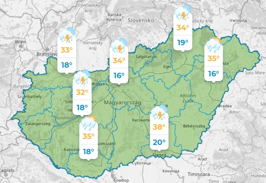 Vasárnap gyakran lesz erősen gomolyfelhős az ég, és általában csak elszórtan, de az északnyugati, északi tájakon többfelé várható zápor, zivatar. Az északnyugati határszélen heves zivatarok is lehetnek felhőszakadással, jégesővel. Sokfelé megerősödik az ÉNy-i szél. Továbbra is marad a 30-35 fok körüli hőség.