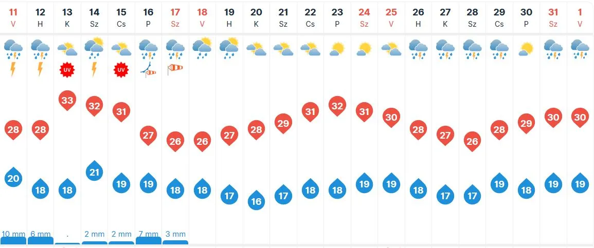 Szerdán már gyakrabban zavarhatják gomolyfelhők a napsütést, és már elszórt záporok, zivatarok is kialakulhatnak. A délkeleti szél északnyugaton élénk, helyenként erős lesz. Délután 28-36 fok valószínű. Csütörtökön a túlnyomóan napos idő mellett helyenként ismét előfordulhatnak záporok, zivatarok. Több helyen élénk, a Dunántúlon erős lehet a keleties szél. A csúcshőmérséklet 27-34 fok között alakulhat