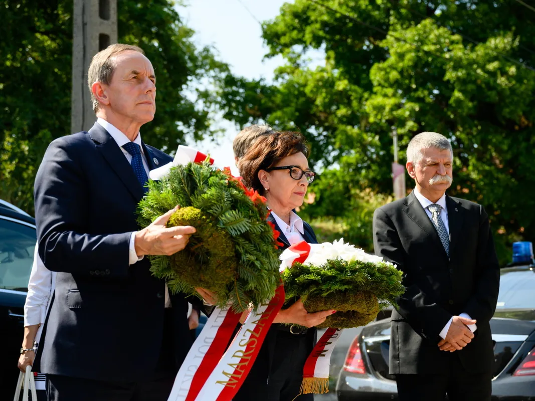 Tomasz Grodzki, a lengyel szenátus elnöke (b) és Elzbieta Witek, a lengyel Szejm elnöke (k), valamint Kövér László, az Országgyûlés elnöke (j) megkoszorúzza a II. világháborús lengyel menekültek által állított Szûz Mária-szobrot Fehérvárcsurgón 2021. július 16-án.