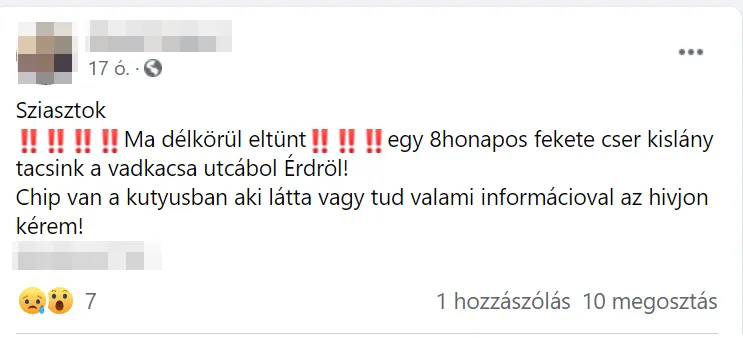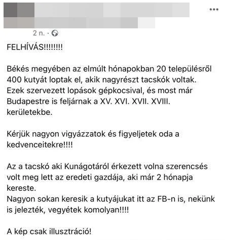 „Békés megyében az elmúlt időszakban kistestű fajtatiszta kutyák tűntek el. Nagyon sokan keresik a kutyájukat itt az FB-n is, nekünk is jelezték, vegyétek komolyan” – ez a szöveg állt a posztban. A kommentek között rengetegen számoltak be hasonló történetekről.