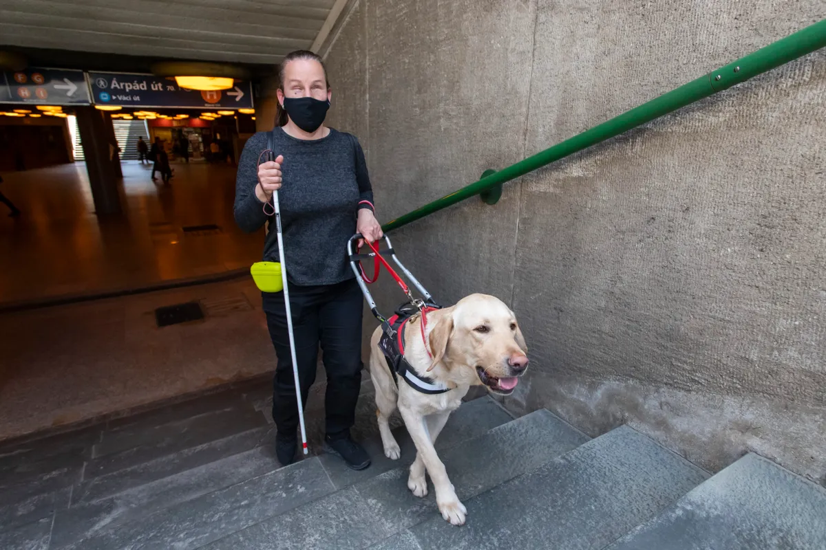 Enikőt elkísértük a metróhoz is, ahol a lépcsők előtt szintén megállt a vakvezető kutya. Láthatóan ügyesen mozognak együtt, Enikő úgy ment le a lépcsőkön, sőt úgy járkál a városban, mintha látna.