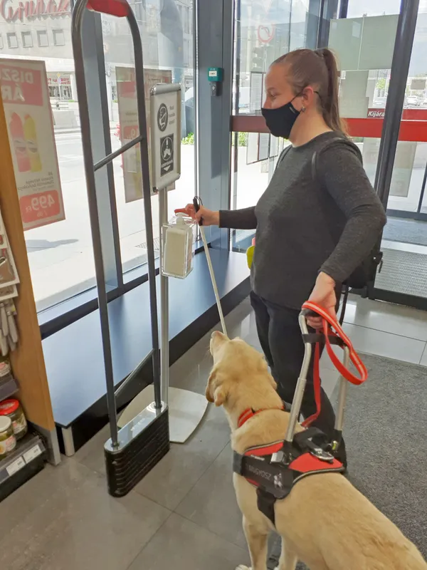 A látássérült emberek ugyanúgy használhatják a boltok bejáratánál kihelyezett kézfertőtlenítőt, mint látó társaik, ám azt megtalálni nem olyan egyszerű nekik – még akkor sem, ha tudják, melyik irányba keressék.