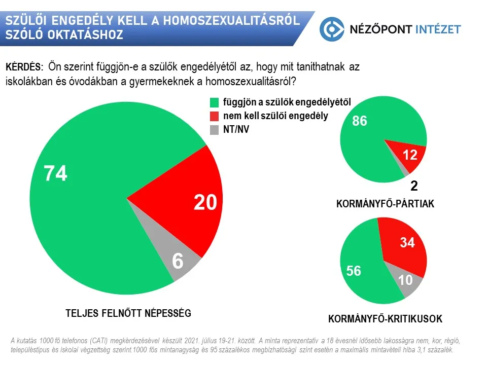 A Nézőpont Intézet felhívja a figyelmet: komoly fejtörést okozhat a baloldalon a kormányzati népszavazás témája, mivel a kormánykritikus személyek többsége, 56 százalékuk is a szülői engedélyek mellett foglalt állást, és mindössze harmaduk áll az LMBTQ-szervezetek oldalán – írták.