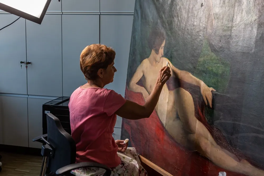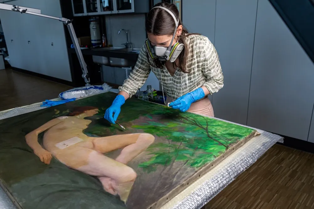 Berta Éva nemrég kezdte el Rozgonyi László Fekvő akt című képének a restaurálását, de már jól látszik a különbség a szennyezett és a letisztított felület között. Többféle oldószert használnak, és mindig mérlegelnek a szakemberek, hogy melyik a legmegfelelőbb.