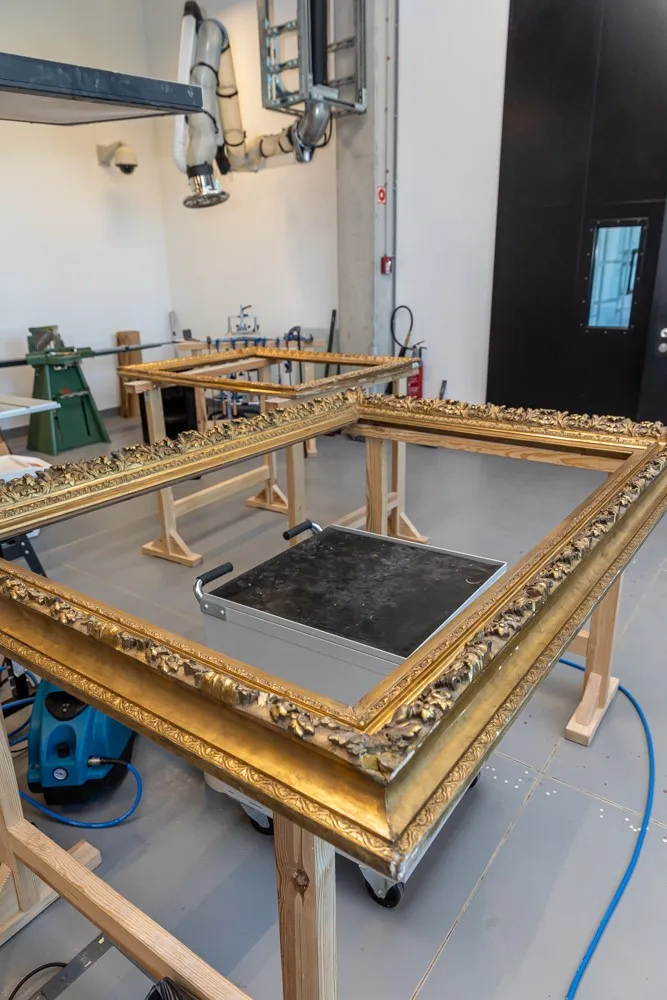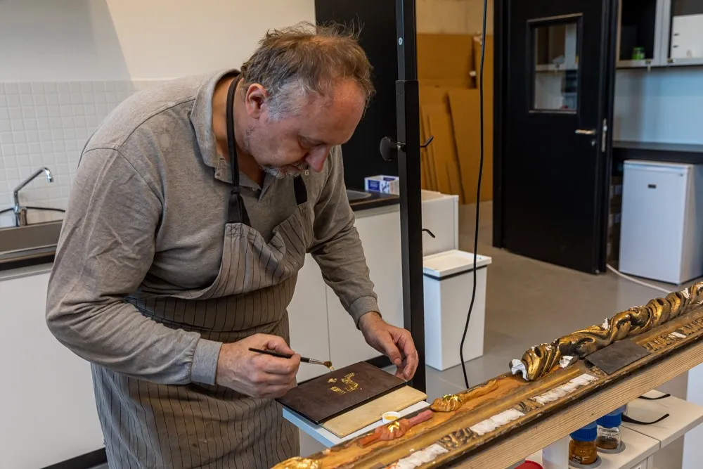 A restaurátori műhelyben aranyat is használnak, hogy eredeti állapotban állítsák helyre a festmények kereteit.