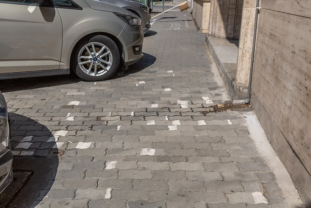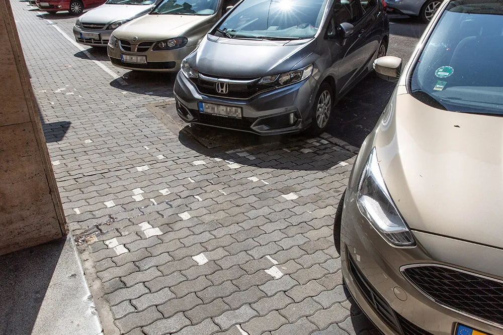 Nem törődtek sokat a kinézettel: a parkolóhelyet a járdától elválasztó csíkkal nem foglalkozva rakták vissza a térköveket Újlipótvárosban. Egészen szürreális!