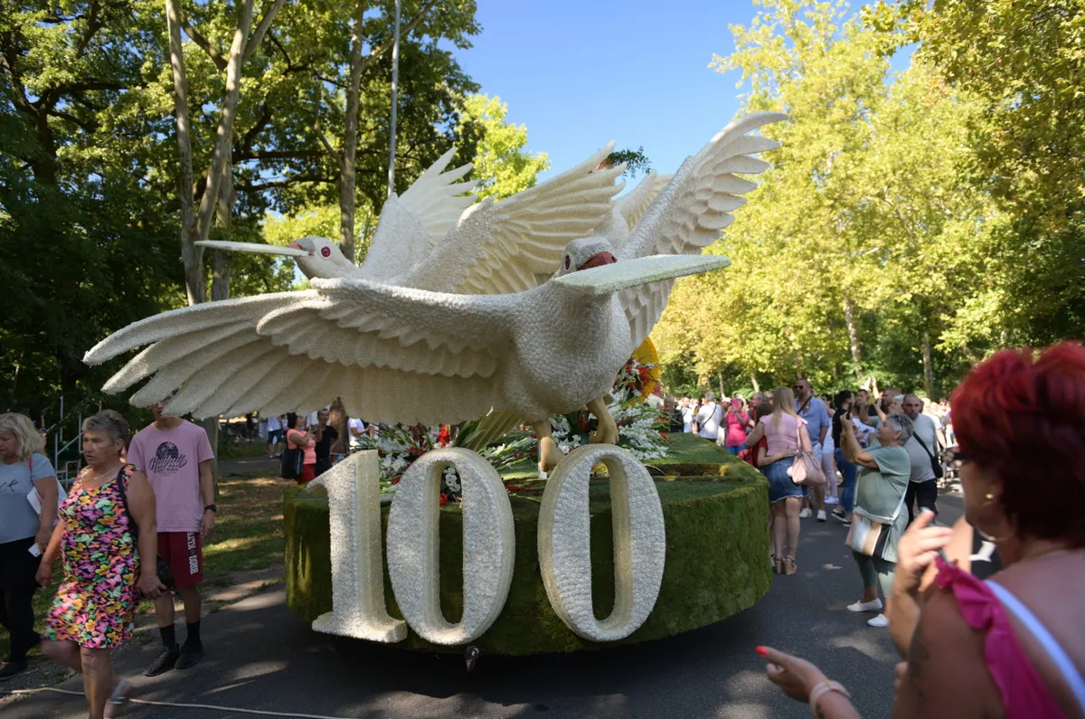 Hozzátette: az idén tizennégy virágkompozíció készült el, köztük a karneválok állandó szereplői, a Szent Koronát és a koronázási ékszereket bemutató kompozíció, valamint a Debrecen címerét megjelenítő kocsi.