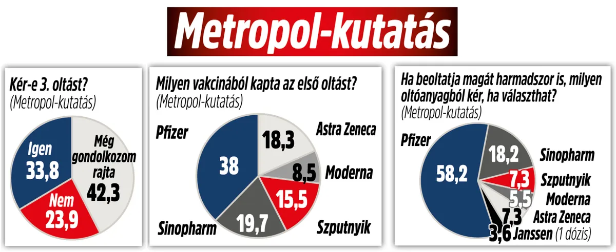 A Metropol készített egy online felmérést. A nem reprezentatív kérdőívükre körülbelül százan válaszoltak olyanok, akik megkapták az első két dózist. Kiderült: körülbelül egyharmad döntötte el, hogy kéri a 3. oltást, egyneggyed utasítja el, a többség még gondolkodik rajta. A válaszolók többsége Pfizert kér harmadiknak.