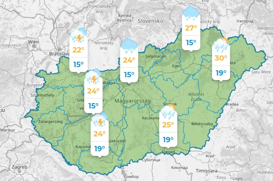 Csütörtökön erősen felhős lesz az ég, és többfelé várható eső, zápor, zivatar. A csapadékos idő hatására a hőmérséklet is csökken: mindössze 20-27°C valószínű délután. Végig élénk lesz az ÉNy-i szél – írta meg a koponyeg.hu.