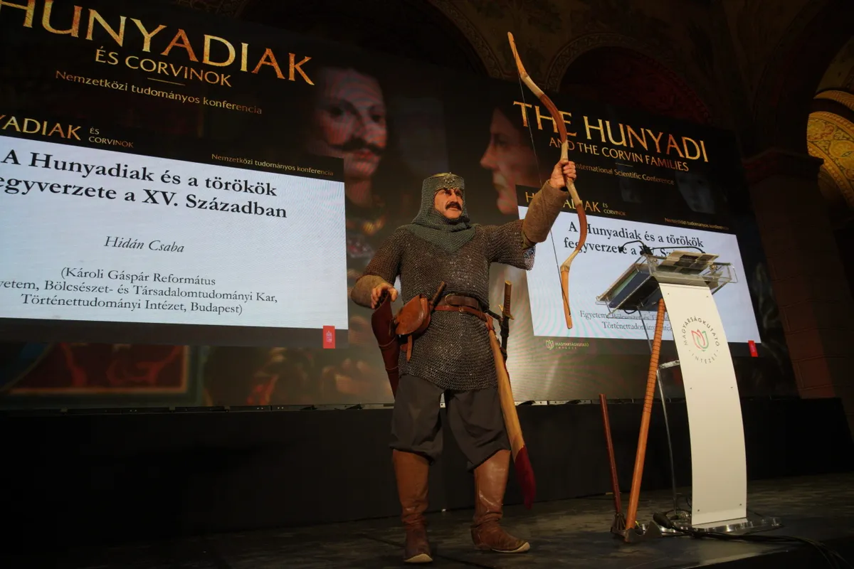 Meglepő fordulat egy konferencián: magyar könnyűlovas fegyverzetben tartott előadást Hidán Csaba László, a Károli Gáspár Református Egyetem Történettudományi Intézetének oktatója.