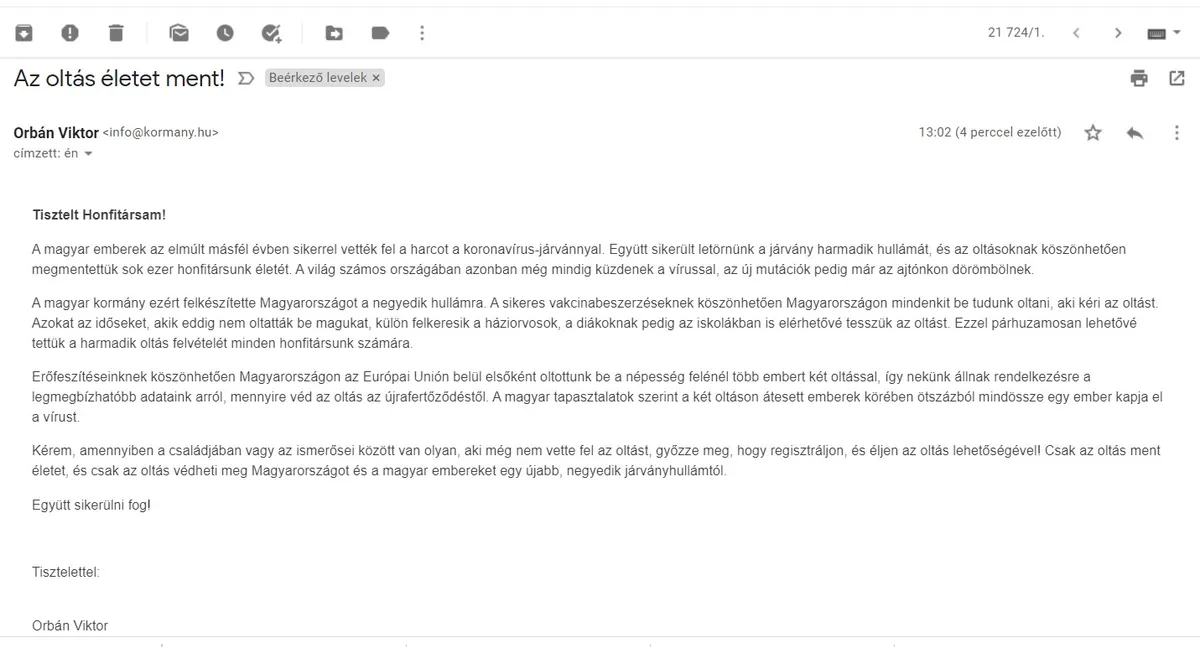 Kérem, amennyiben a családjában vagy az ismerősei között van olyan, aki még nem vette fel az oltást, győzze meg, hogy regisztráljon, és éljen az oltás lehetőségével! Csak az oltás ment életet, és csak az oltás védheti meg Magyarországot és a magyar embereket egy újabb, negyedik járványhullámtól.