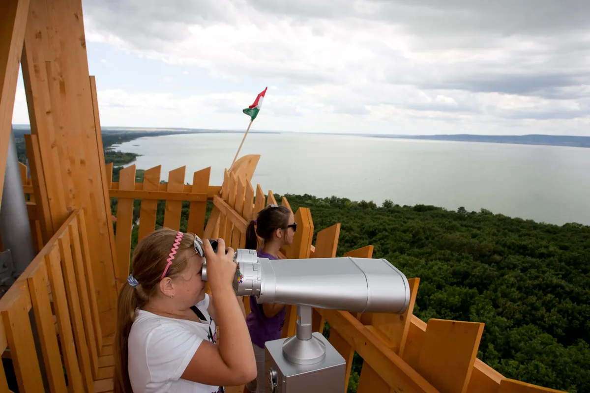 Érdeklõdõk gyönyörködnek a fonyódi Várhegyen felállított kilátóból. A csaknem 240 méter magas dombon, egy adótorony köré épült faépítmény elkészítéséhez a tóparti város önkormányzata 67 millió forint uniós támogatást nyert el.