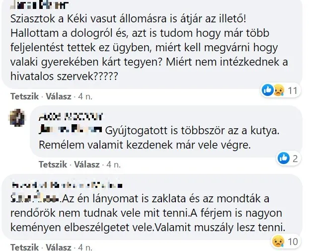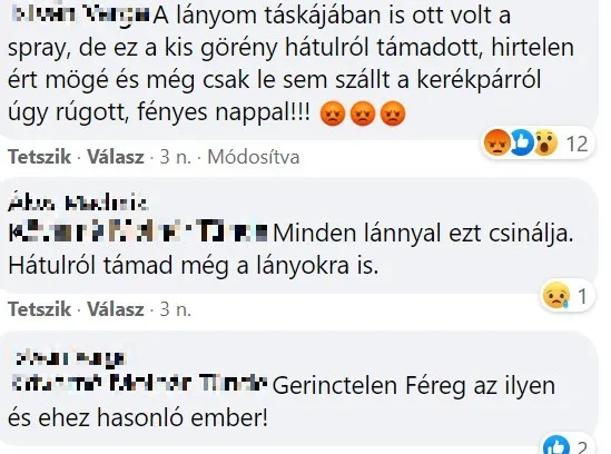 Több anyuka is hozzászólt az esethez, és elmesélték, hogy az ő kislányukat is megtámadta a férfi. Egyikőjük gyermekénél még paprika spray is volt, de így sem tudta megállítani a támadót. A férfi rugdosni kezdte a lányt, aki még a kerékpárjáról sem tudott leszállni.