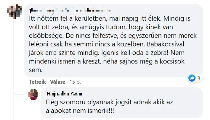 Az ilyen kereszteződésekben a gyalogosoknak kizárólag a kanyarodó forgalommal szemben van elsőbbségük. Ez pedig komoly félelmet kelt az emberekben, mert nem tudják, hogy a kanyarodó autók észreveszik-e őket egyáltalán, vagy hogy valóban megállnak-e. Egy felfestett zebránál azonban teljesen más a helyzet, mert az autósok jó esetben átengedik a gyalogosokat, így ők biztonságosan átkelhetnek a túloldalra. Az egyik Facebook-csoportjában is erről indult eszmecsere. Több környéken lakó kifejezte, hogy amióta nincs zebra a kereszteződésben, szabályosan retteg, valamint hogy nem biztosak benne, hogy minden autós ismeri a KRESZ szabályait.