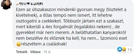 „Ezen az útszakaszon mindenki gyorsan megy (tisztelet a kivételnek), a 80-as tempó nem ismert, itt lehetne osztogatni a csekkeket. Többször jártam ezt a szakaszt, mert kikerüli a 4-es forgalmát (legalábbis nekem), de gyerekkel már nem merem. A beláthatatlan kanyarokról nem beszélve, és előznek ha kell, ha nem... Szomorú eset, részvétem a családnak!” – fogalmazott.