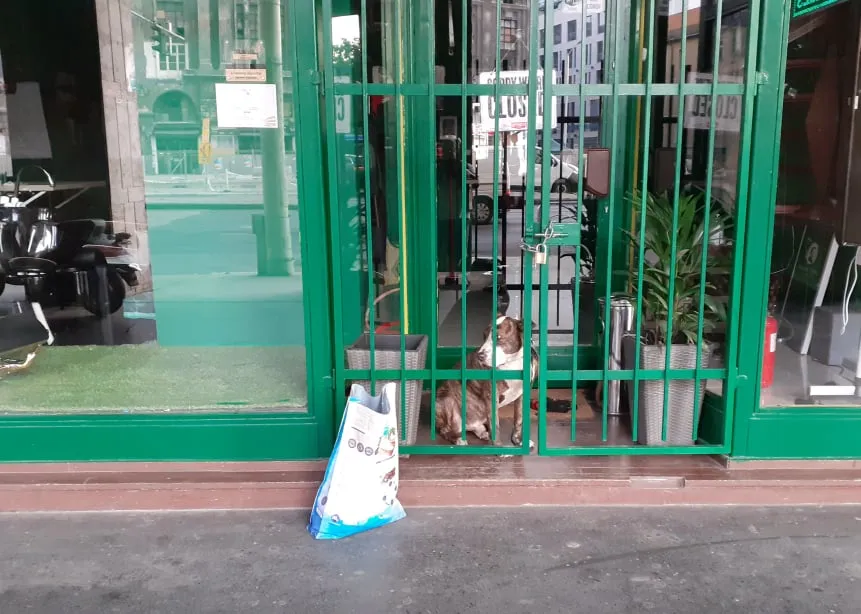 A kutya az ajtó és a rács közötti előtérben gubbaszt egy lábtörlő előtt és figyeli az utca népét. Van előtte egy szatyor, de arra még nem sikerült magyarázatot kapnunk, hogy mi lehet benne vagy van-e funkciója az állat számára, mindenesetre érdekes és szomorú az egész.