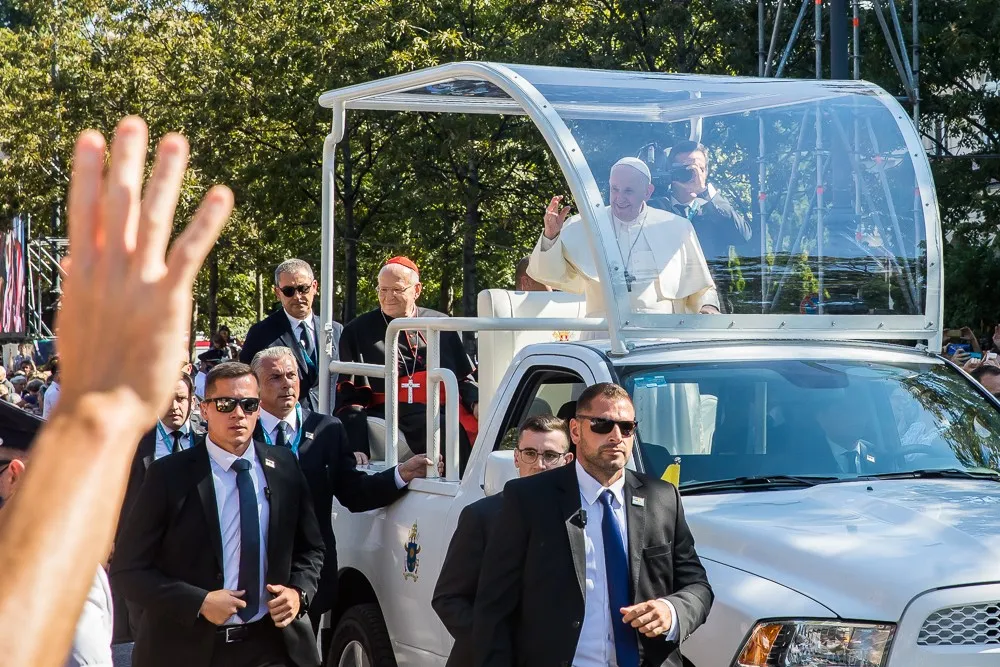 A pápa rendkívül közvetlenül viselkedett, amikor a konvoja végighajtott a hívek mellett: volt, akivel kezet fogott, és kisbabákat is megáldott, akiket a biztonsági szolgálat emberei segítettek fel a pápamobilra.
