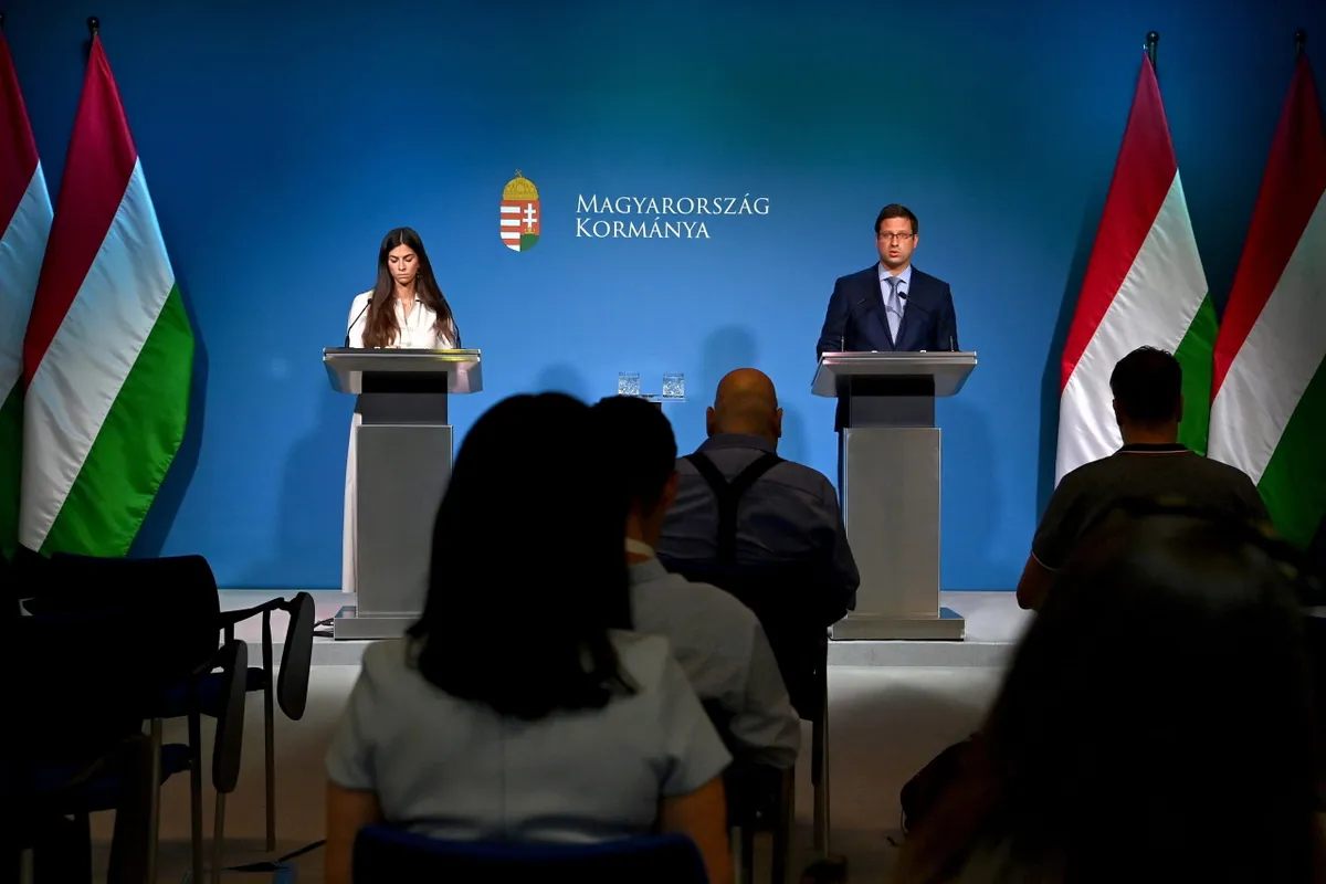 Szentkirályi Alexandra kormányszóvivõ és Gulyás Gergely, a Miniszterelnökséget vezetõ miniszter a Kormányinfó sajtótájékoztatón a Miniszterelnöki Kabinetiroda sajtótermében 2021. július 7-én.