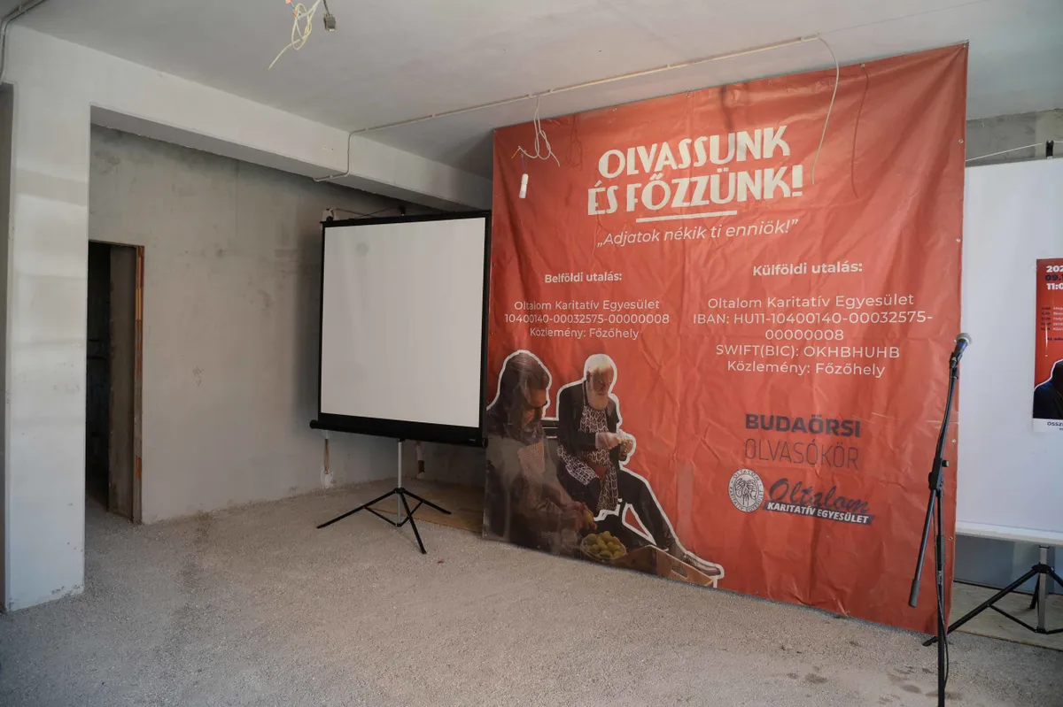 „A Dankó utca 13. alatt álló félkész épület 10 éve üresen állt” – mondta el Tóth Zoltán, a Budaörsi Olvasókör vezetője. „Egy évvel ezelőtt Iványi Gáborral, az Oltalom Karitatív Egyesület vezetőjével együtt határoztuk el, hogy legalább a földszintet és a pincét átalakítjuk, hogy abban főzni lehessen. A jelenlegi, Dankó utcai konyha ugyanis szűkös. Az étkeztetést szociális munkások és önkéntesek végzik most is és később is ők fogják. Az alapanyagok nagy része önkéntesektől származik, a nagy cégektől egészen a nagymamákig adományoznak számunkra. Az Olvasókör eddig, 9,6 millió forintot gyűjtött az átalakításhoz, ez magánadományokból jött össze. Mi kizárólag a kultúrát és a közétkeztetést kapcsoljuk össze a projekttel, ahogyan a címe is mutatja.”
