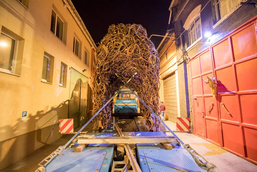 A hullajtott agancsokból készült bőgő szarvasbikafej péntek éjfélkor indult útnak szétszerelt állapotban az alkotó csepeli műhelyéből. Három óriási trélerrel vitték a világkiállítás helyszínére, Kőbányára, ahová közel két órás út után érkezett meg. Egy kisebb technikai probléma is akadt az út alatt, ugyanis a Kerepesi útnál a híd alatt elakadt az egyik vontató, mert alacsony volt a trolivezeték és az agancskapu beszorult.
