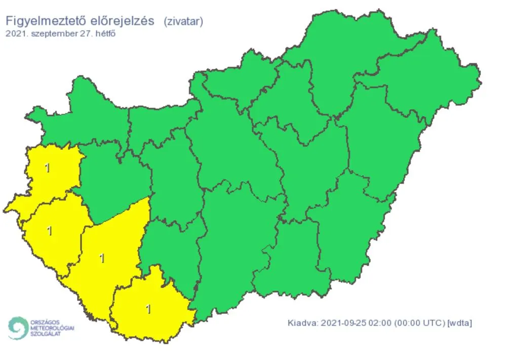 Hétfőre az Országos Meteorológiai Szolgálat elsőfokú figyelmeztetést adott ki az ország nyugati részére zivatarok miatt. Mint írták, elsődleges veszélyforrást a villámlás jelent, emellett esetenként szélerősödés, jégeső előfordulhat.