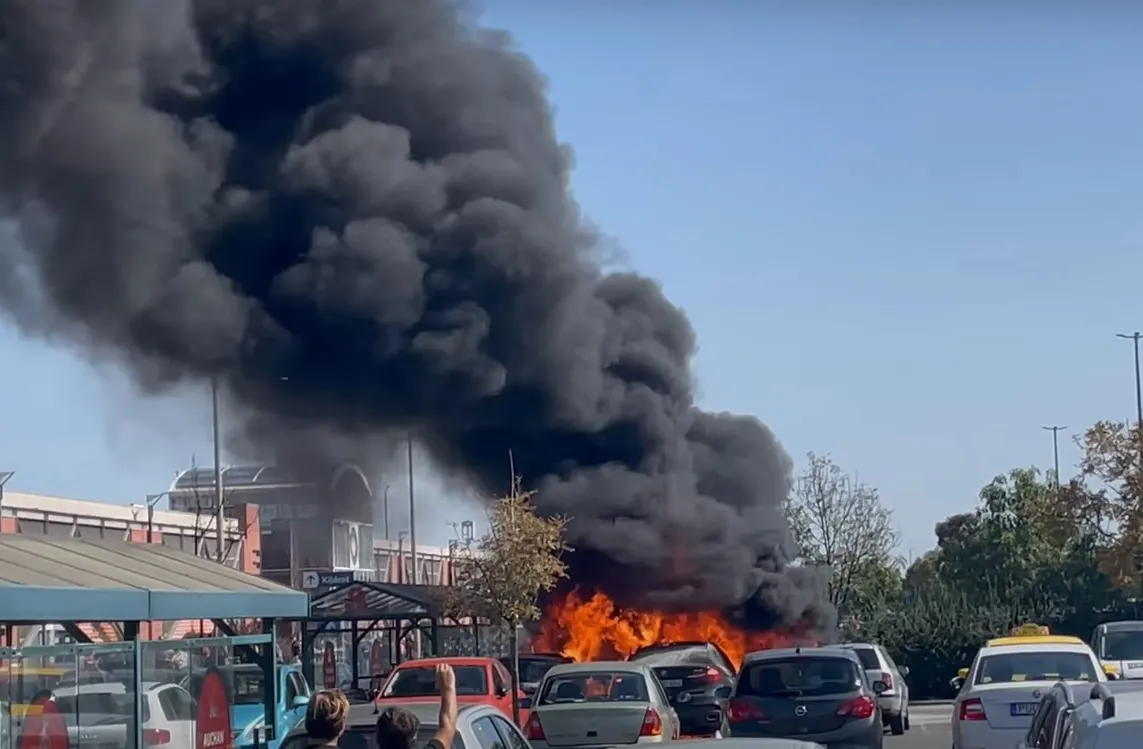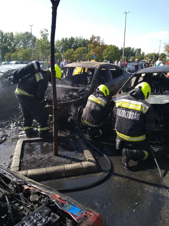 Kigyulladt öt személyautó Budapest XXIII. kerületében, Soroksáron a Bevásárló utca közelében, egy szupermarket parkolójában.
