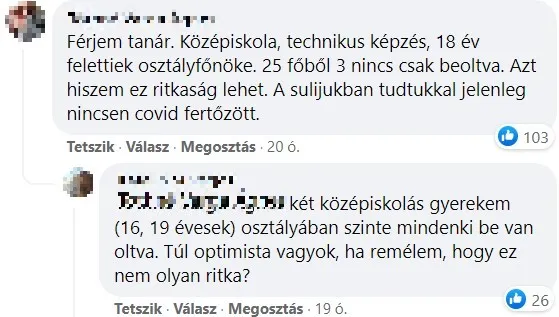 „A férjem tanár. Középiskola, technikus képzés, 18 év felettiek osztályfőnöke. 25 főből 3 nincs csak beoltva” – írta egy asszony, aki nem is tud ott Covid fertőzöttről.