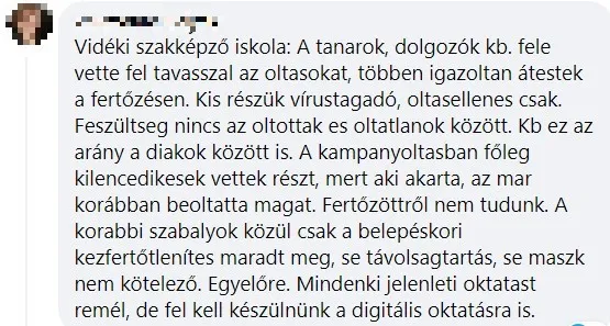 „Vidéki szakképző iskola: A tanárok, dolgozók kb. fele vette fel tavasszal az oltásokat, többen igazoltan átestek a fertőzésen. Kis részük vírustagadó, oltásellenes csak. Feszültség nincs az oltottak és oltatlanok között. Kb ez az arány a diákok között is. A kampányoltásban főleg kilencedikesek vettek részt, mert aki akarta, az már korábban beoltatta magát. Fertőzöttről nem tudunk. A korábbi szabályok közül csak a belépéskori kézfertőtlenítés maradt meg, se távolságtartás, se maszk nem kötelező. Egyelőre. Mindenki jelenléti oktatást remél, de fel kell készülnünk a digitális oktatásra is.”