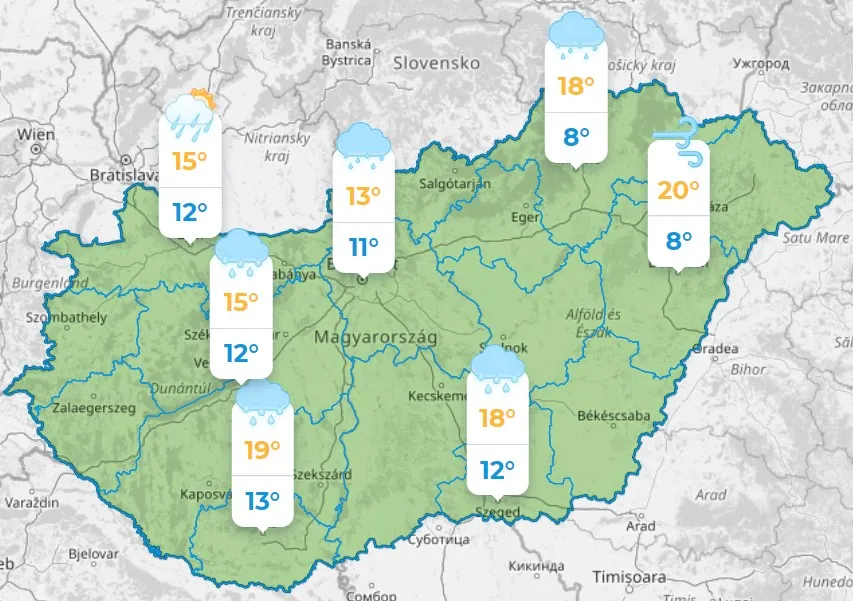 Erősen megnövekszik a felhőzet, és eleinte inkább csak a Dunántúlon, később többfelé várható eső, zápor, néhol zivatar is. A Miskolc-Debrecen vonaltól keletre viszont kicsi az esély a csapadékra. Eleinte a délkeleti, majd az északnyugati szél élénkül meg. 12 és 20 fok között alakul a hőmérséklet – Ék-en lehet a legmelegebb idő.