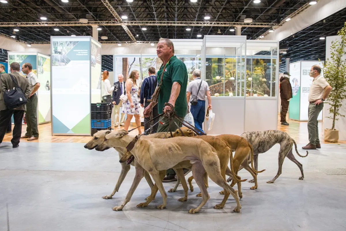 Agarakat vezet egy férfi az Egy a természettel Vadászati és Természeti Világkiállítás nemzetközi csarnokában a Hungexpo Budapest Kongresszusi és Kiállítási Központban 2021. szeptember 26-án.