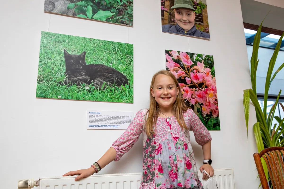 „Ez itt a nagymamám cicája, az ott fent pedig egy szelfi rólam” – mutatott fülig érő mosollyal a kiállított képeire Lilla, és azt is elmesélte, hogy a képeket a telefonjával fotózta le.