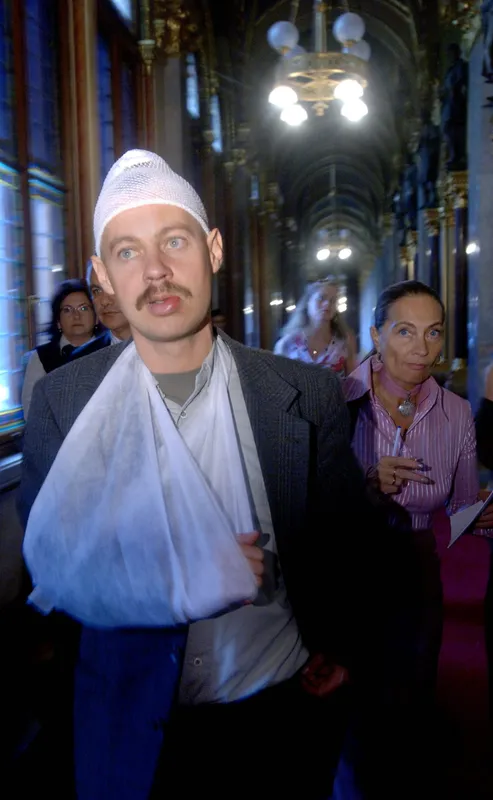 Révész Máriusz, a Fidesz – Magyar Polgári Szövetség országgyűlési képviselője, aki az előző napi tüntetésen megsérült, érkezik az Országgyűlés plenáris ülésére.