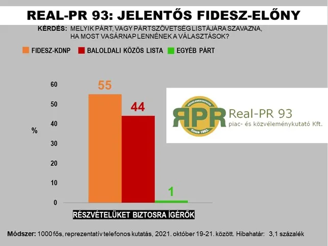 A Real-PR 93. debreceni székhelyű országos és helyi közvélemény-kutatásokkal foglalkozó cég, amely kiemelt figyelmet szentel annak, hogy a budapesti politikai vitákban a vidéki Magyarország véleménye is megjelenjen. A kutatás 1000 fő telefonos megkérdezésével készült, 2021. október 19. és 21. között, a felnőtt társadalomra kora, neme és lakóhelye szerint reprezentatív mintán. A hibahatár legfeljebb +/-3,1%.