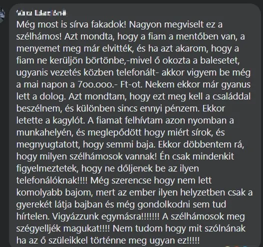 „Azt mondtam, hogy ezt meg kell a családdal beszélnem, és különben sincs ennyi pénzem. Ekkor letette a kagylót. A fiamat felhívtam azon nyomban a munkahelyén, és meglepődött hogy miért sírok, és megnyugtatott, hogy semmi baja. Ekkor döbbentem rá, hogy milyen szélhámosok vannak! Én csak mindenkit figyelmeztetek, hogy ne dőljenek be az ilyen telefonálóknak!!!” – meséli a történteket az átvert nő.